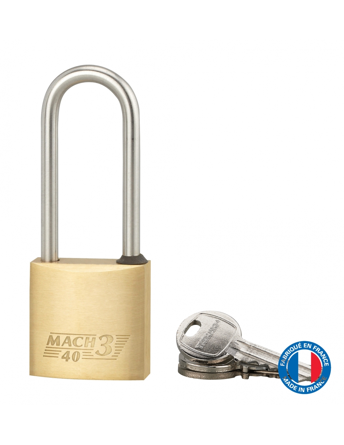 Cadenas à clé Mach 3, laiton, extérieur, anse 1/2 acier, 40mm, 2 clés - THIRARD
