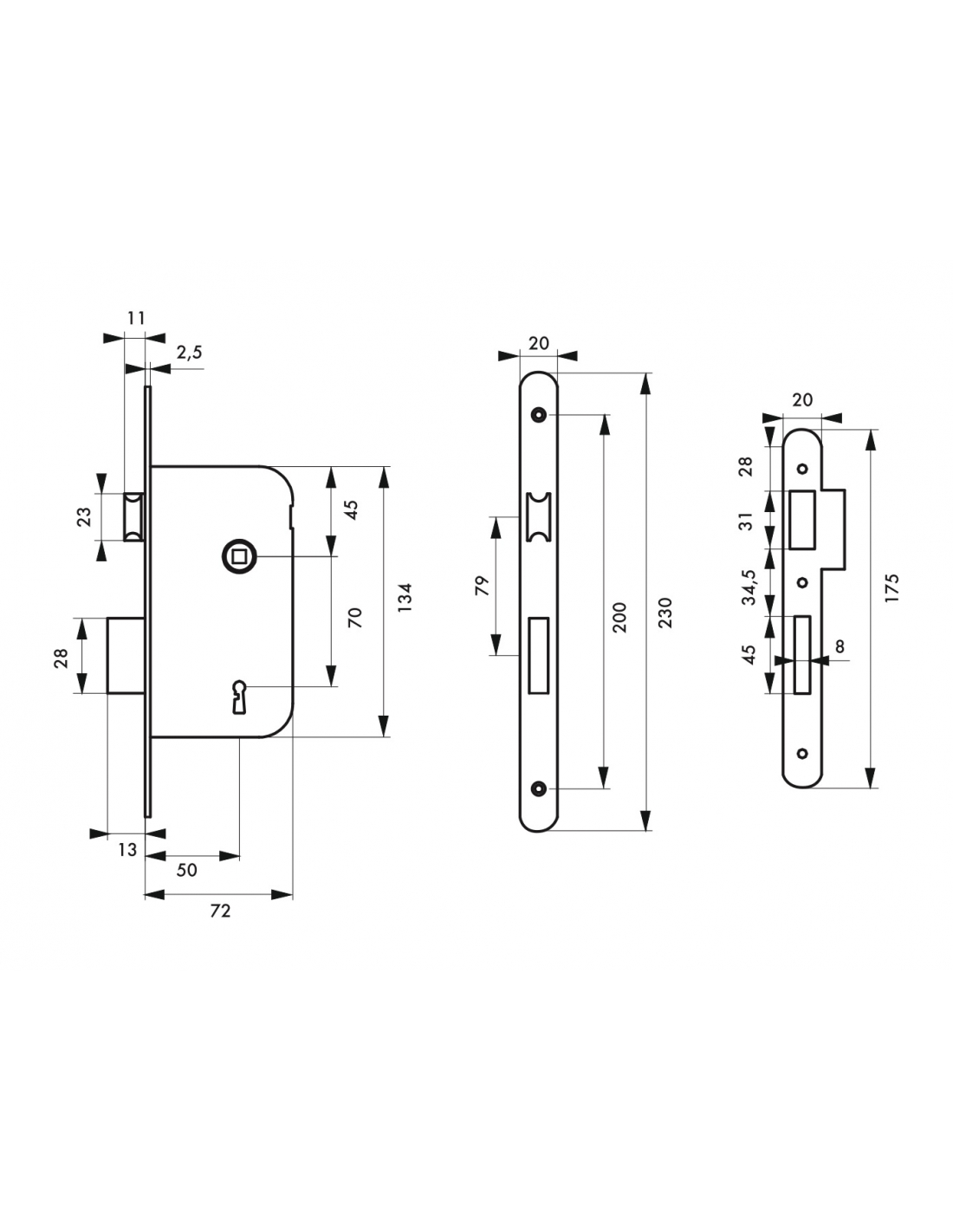 Coffre acier embouti épaisseur 10 mm. Têtière acier. Demi-tour alliage zingué réversible sans démontage du coffre. Pêne acier zingué. Gâche plate acier. Carré 7mm, entr’axe 70 mm. 1clé - 6 variures.