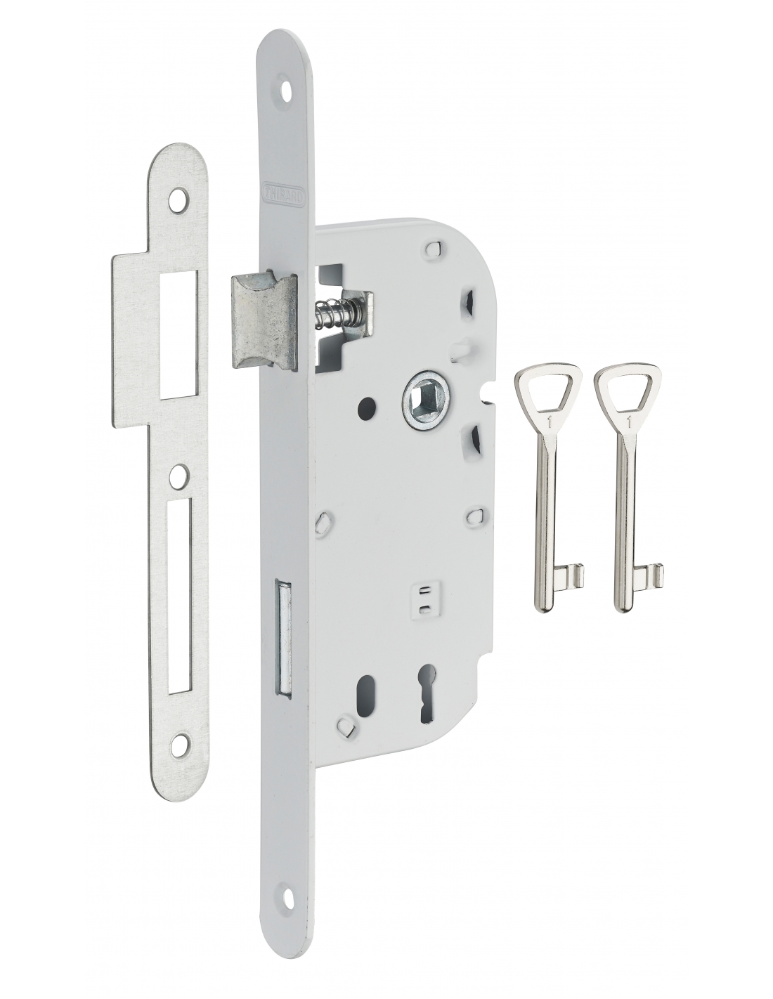 Serrure encastrable à clé pour porte de chambre, axe 40mm, bouts ronds, blanc, 2 clés - THIRARD
