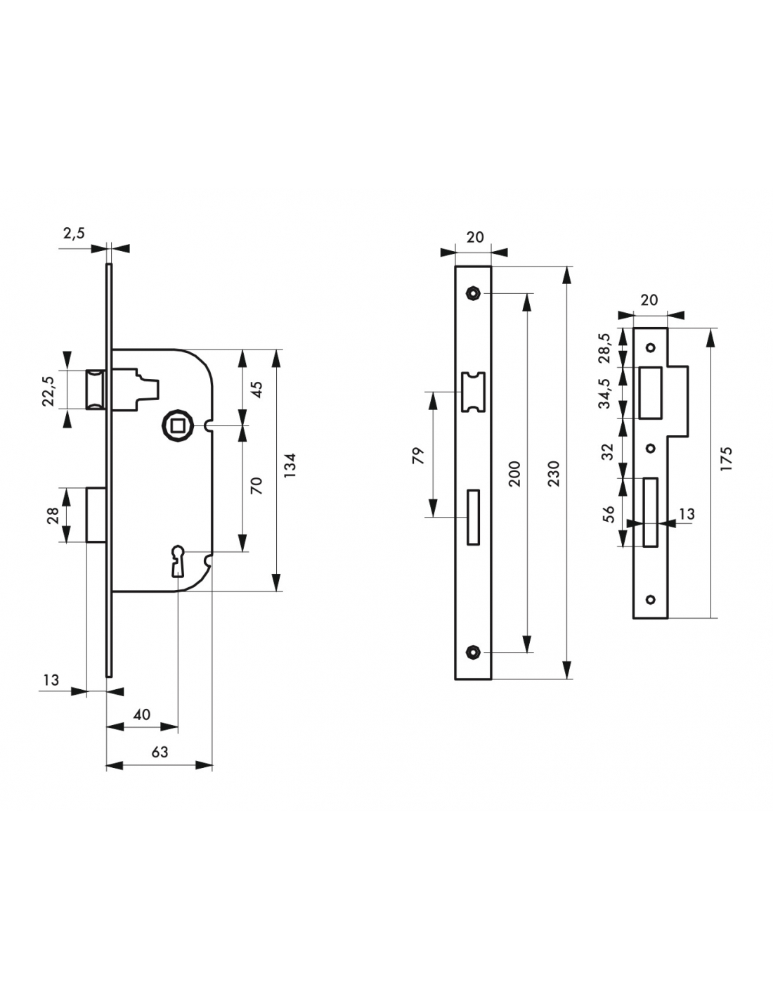 Coffre acier embouti. Têtière acier. Demi-tour alliage réversible sans démontage du coffre. Pêne acier. Gâche plate acier. Mécanisme à 1 tour. Carré 7mm, entr’axe 70 mm. 1 clé. 6 variures
