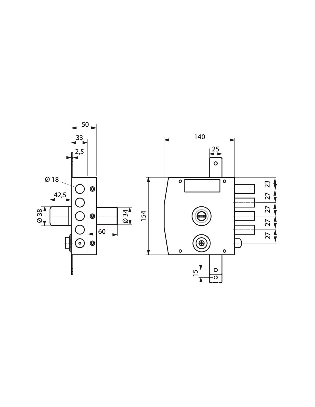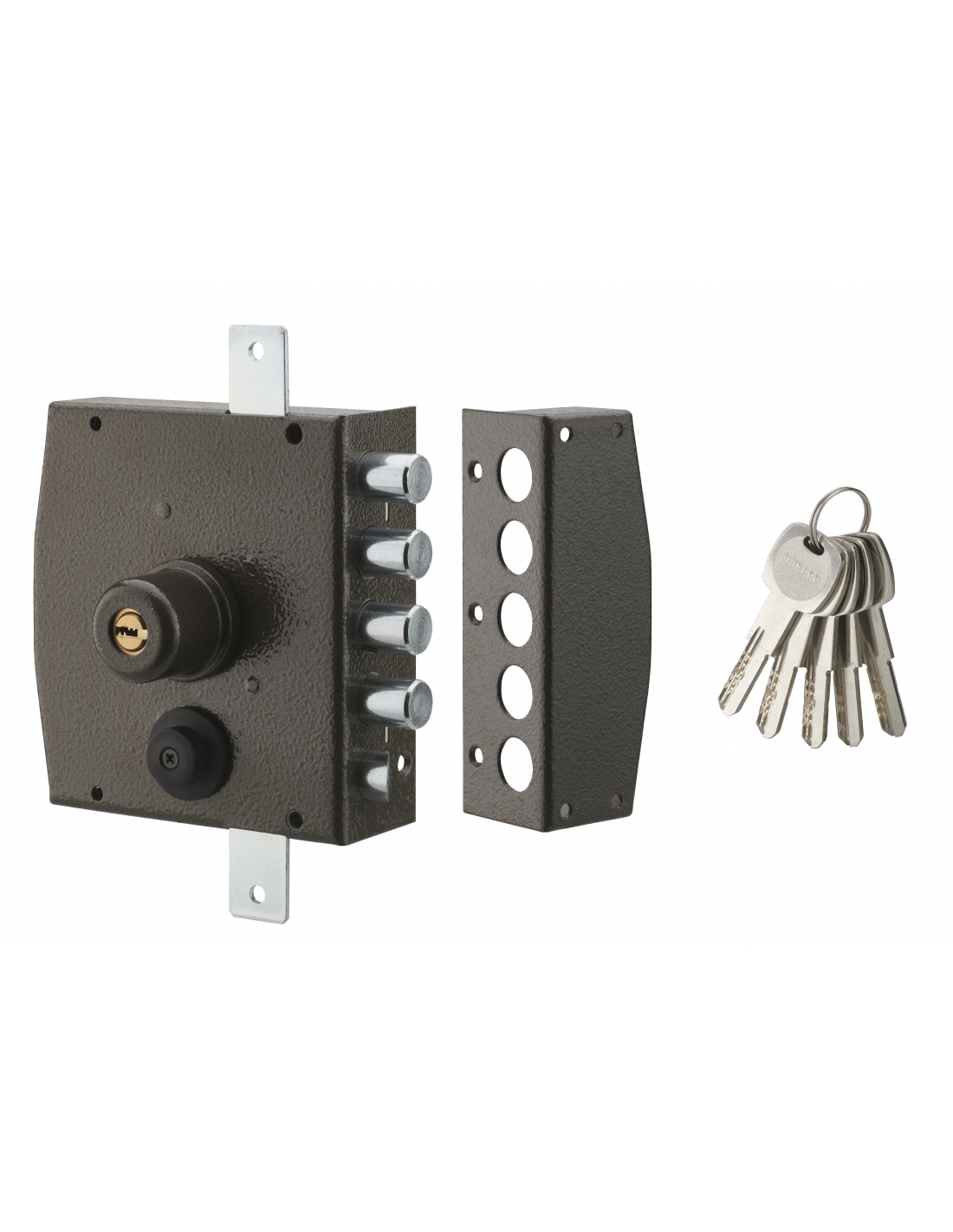 Serrure en applique à double entrée pour porte d'entrée, 154x140mm, 3 pts, droite, 5 clés - THIRARD
