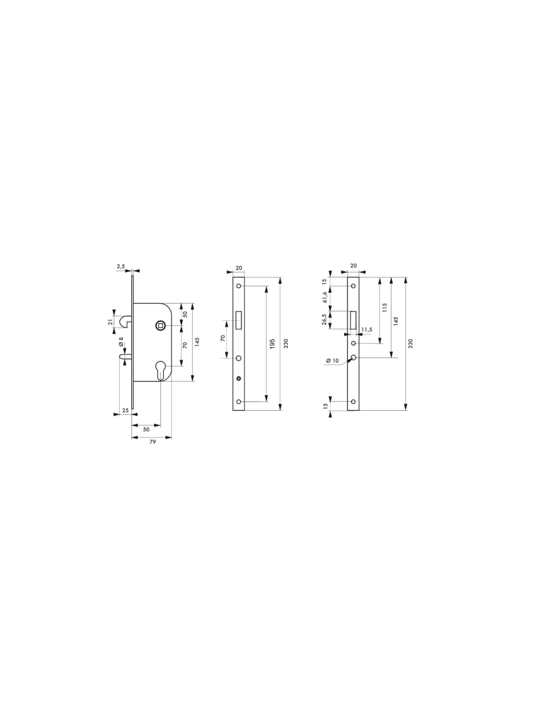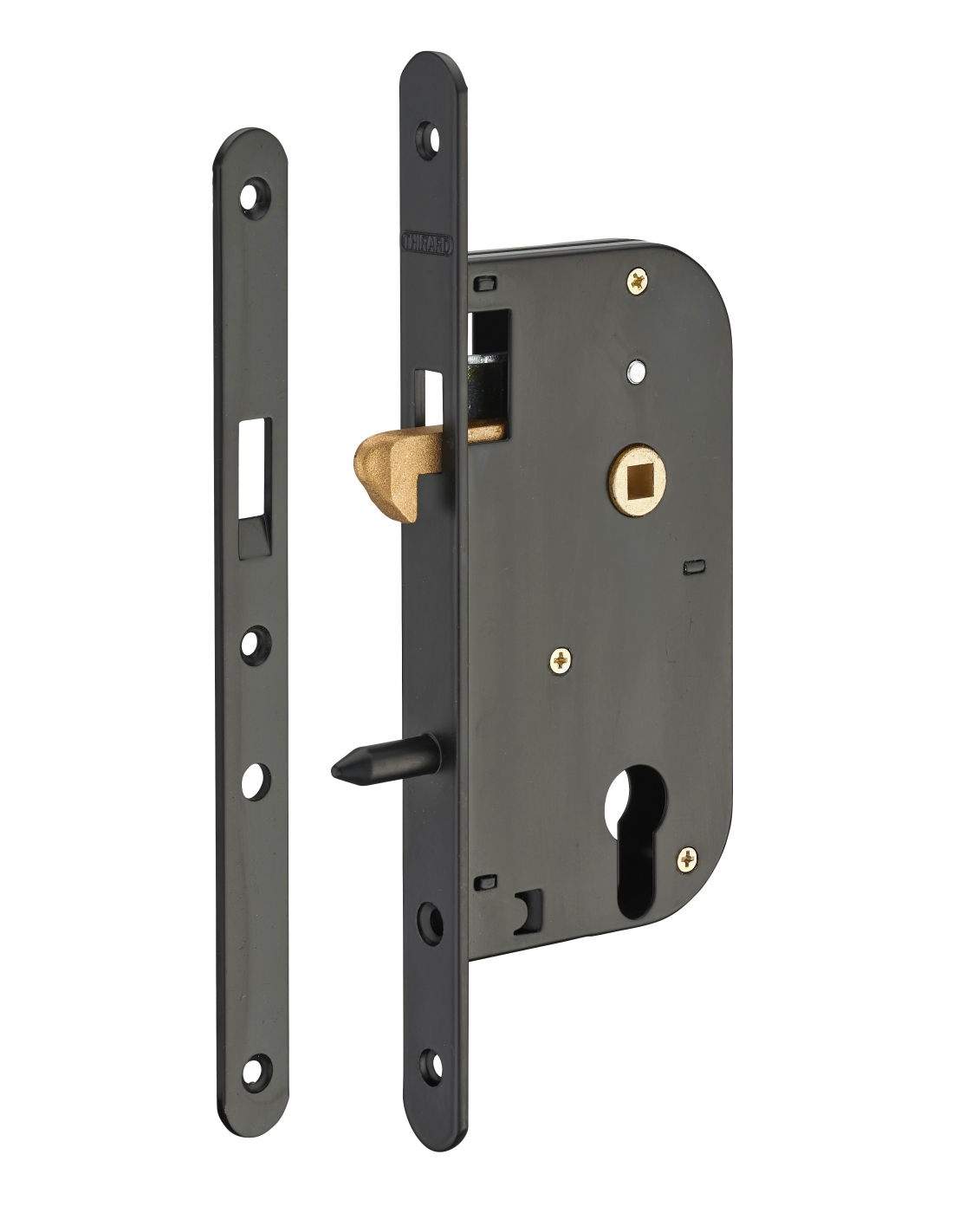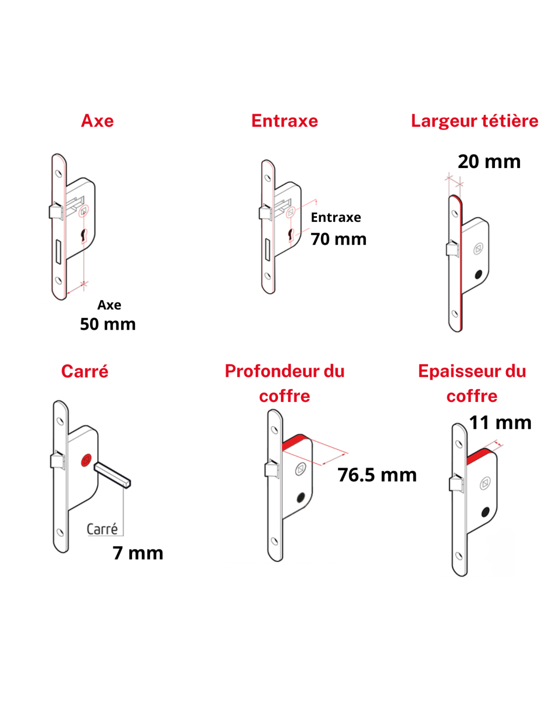 Coffre acier embouti. Têtière acier. Pêne crochet laiton. Gâche plate acier. Carré 7mm, entr’axe 70 mm. Rappel du crochet par la clé.