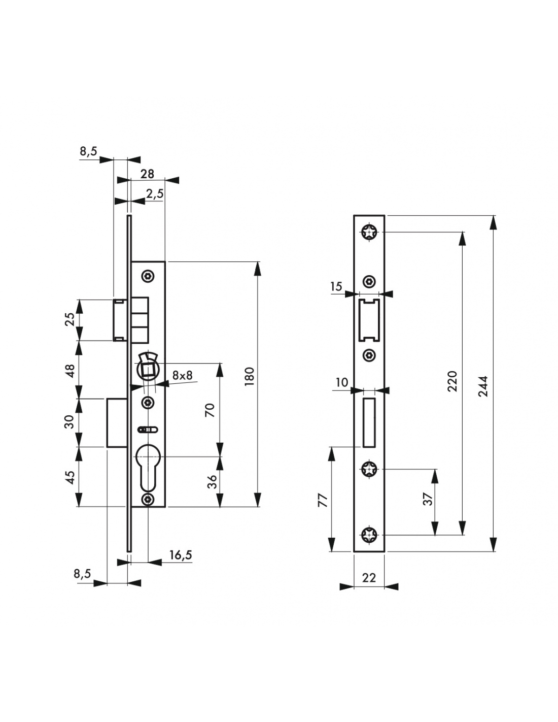 Coffre acier. Têtière inox. Demi-tour réversible sans démontage du coffre. Pêne alliage nickelé. Gâche plate inox. Carré 8 mm avec fourreau réducteur 7 mm. Entr’axe 70 mm