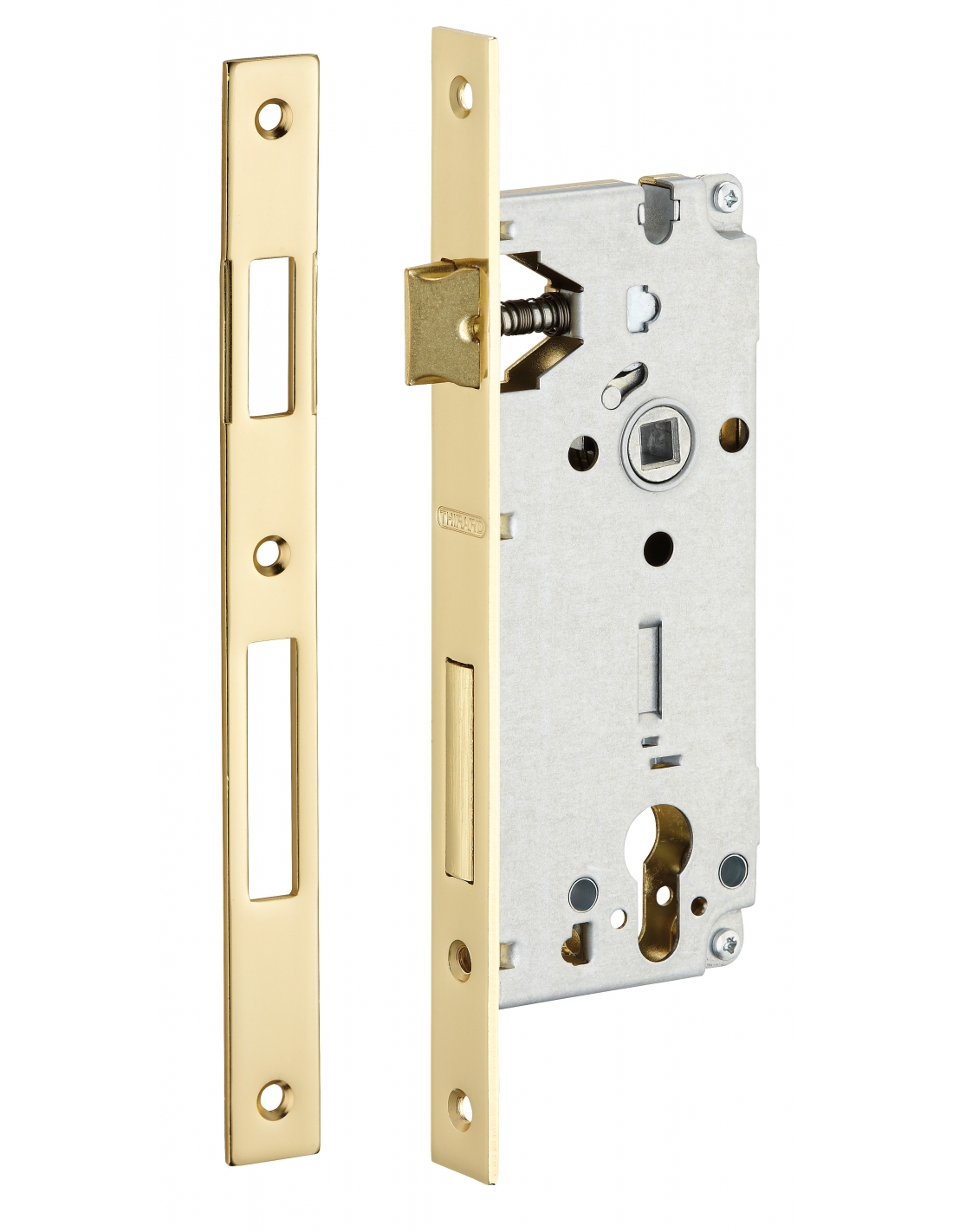 Boitier de serrure encastrable à cylindre pour porte d'entrée, axe 45mm, bouts carrés, têtière laitonnée - THIRARD
