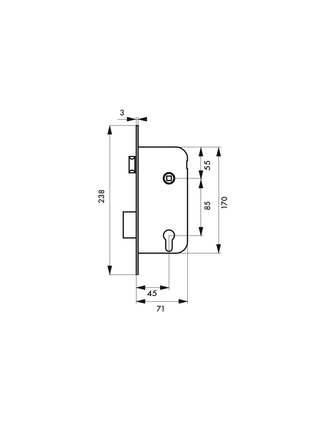 Coffre acier embouti épaisseur 13 mm. Têtière acier bouts Carrés. Demi-tour réversible sans démontage du coffre. Pêne alliage zingué. Gâche plate acier. Carré 8 mm, entr’axe 85 mm. Rappel du 1/2 tour par la clé.