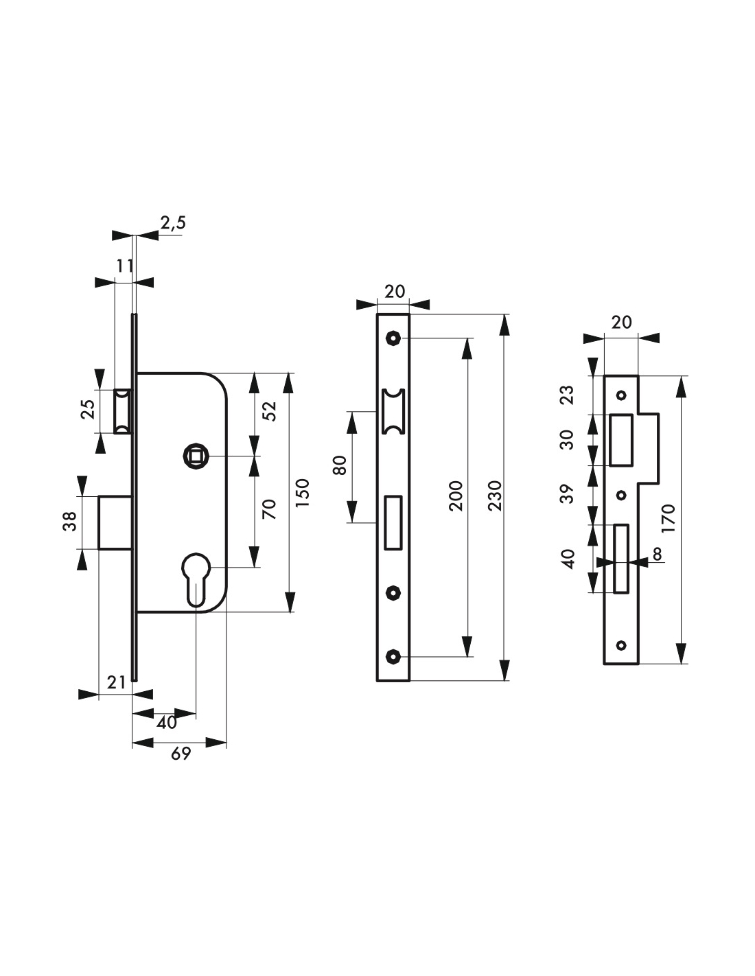 Coffre acier embouti épaisseur 15 mm. Têtière acier. 1/2 tour zamak réversible sans démontage du coffre. Pêne laiton. Gâche plate acier zingué. Mécanisme à 2 tours. Rappel du 1/2 tour par la clé. Carré 7mm, entr’axe 70 mm