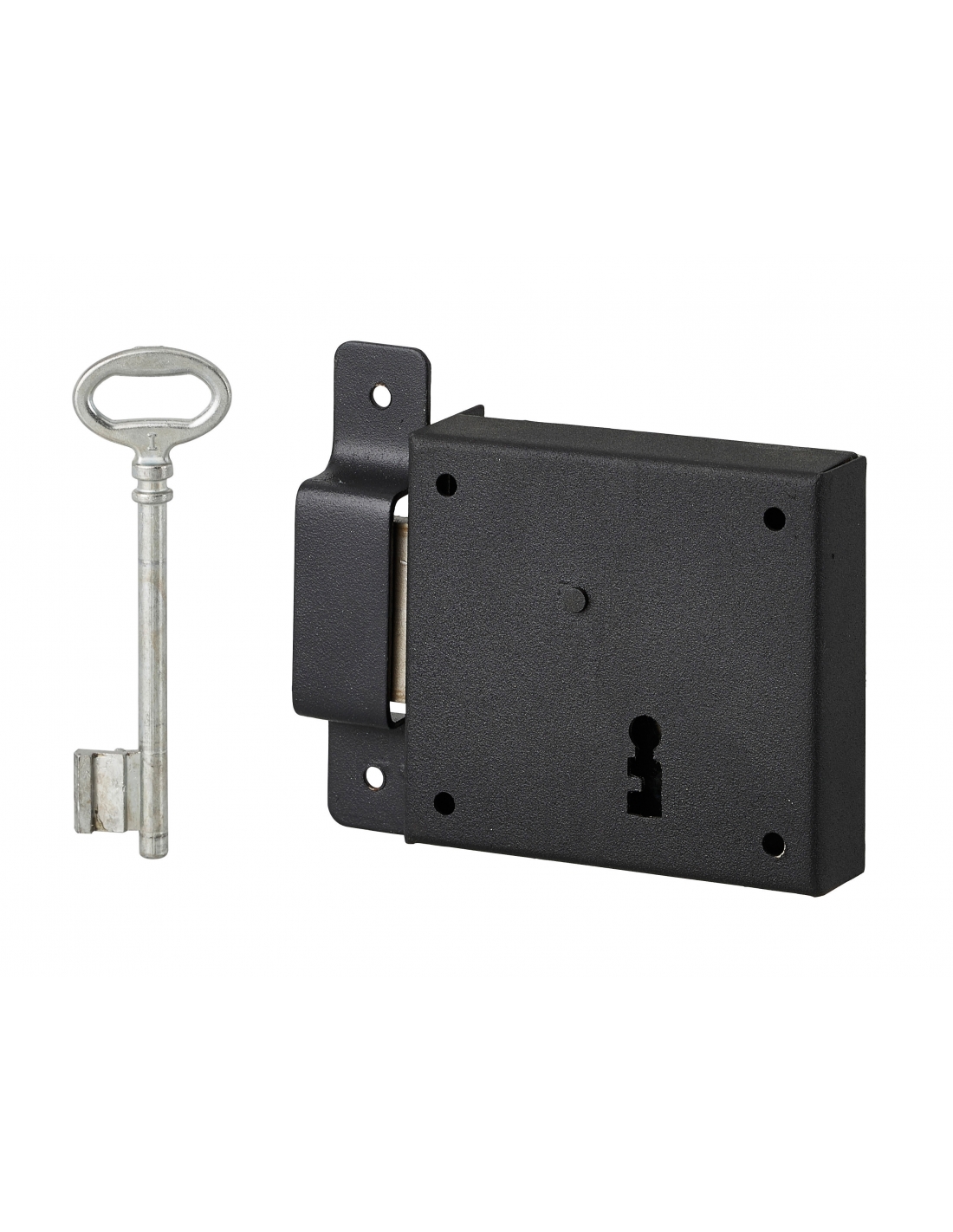 Serrure horizontale en applique à clé pour porte de cave, pêne seul, gauche, axe 50mm, 85x76mm, noir, 1 clé - THIRARD