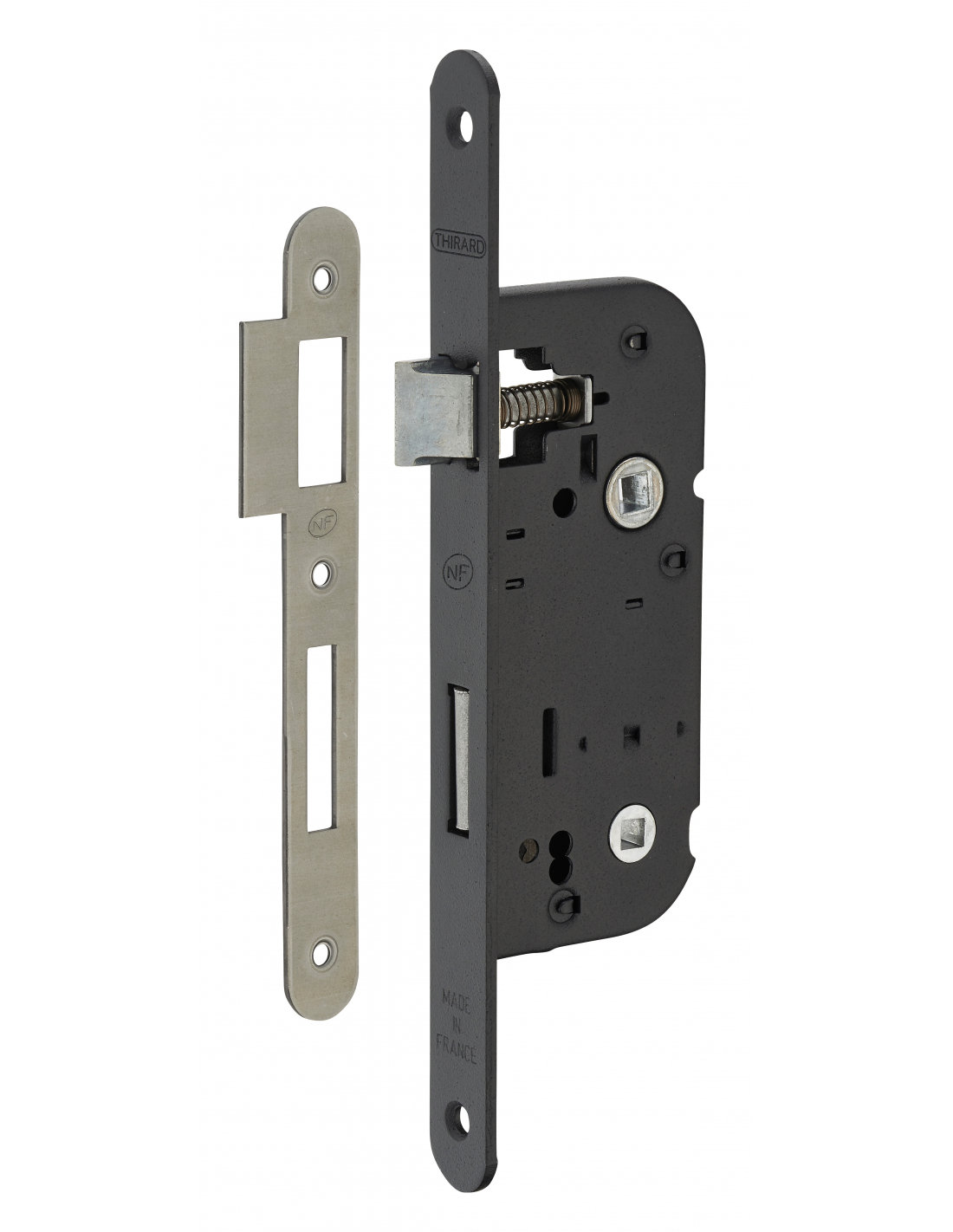Serrure encastrable NF à condamnation pour salle de bain et toilette, axe 40mm, bouts ronds, noir - THIRARD