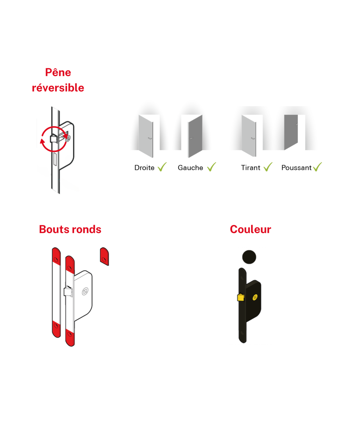 Coffre acier embouti. Têtière acier. Demi-tour alliage réversible sans démontage du coffre. Pêne acier. Gâche plate acier. Carré 7mm, entr’axe 70 mm.