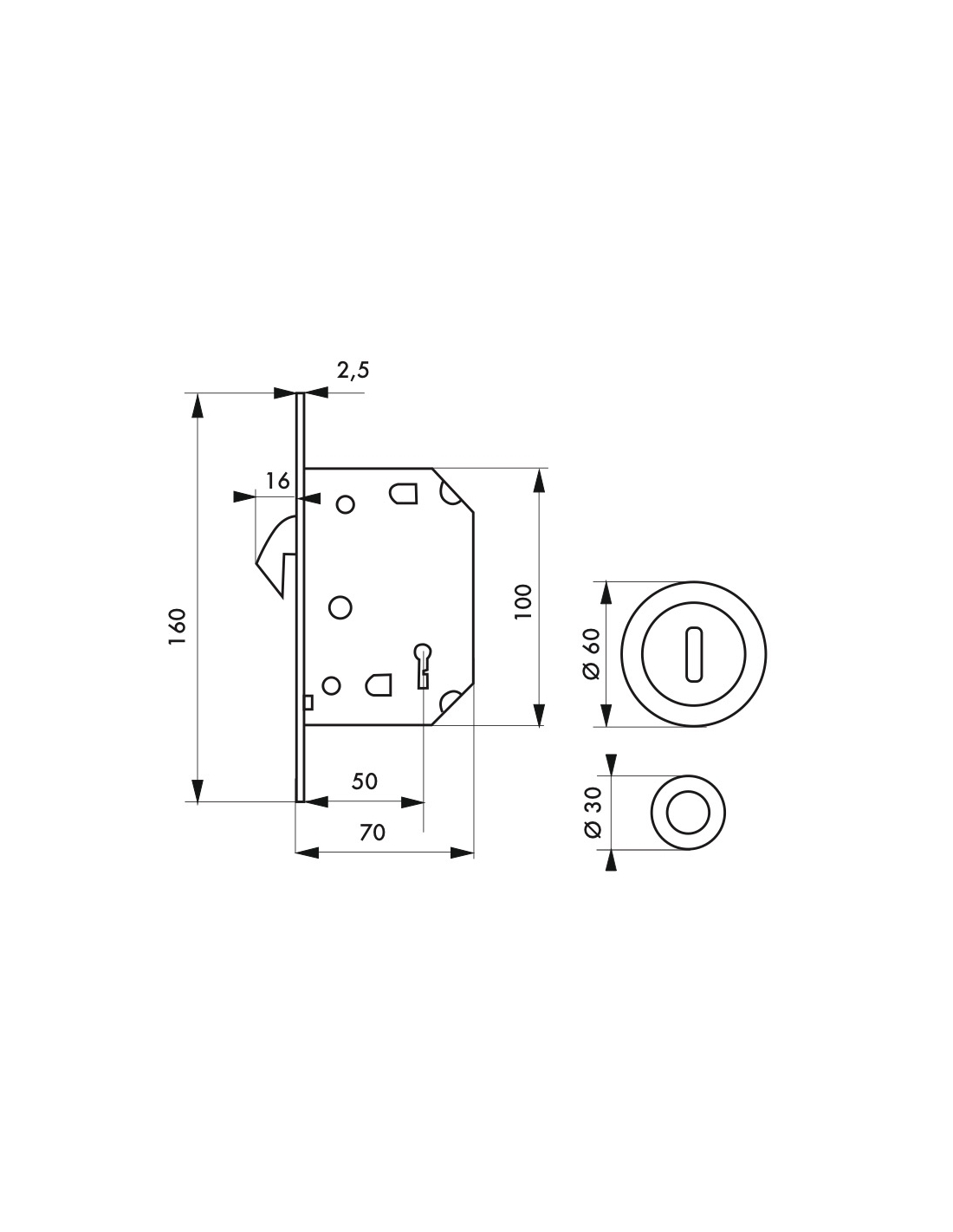 Coffre acier embouti épaisseur 11 mm. Têtière acier bouts ronds. Pêne crochet. Gâche plate acier. Poignées cuvette et tirage sur champs. Pour porte ép. 50 mm maxi.