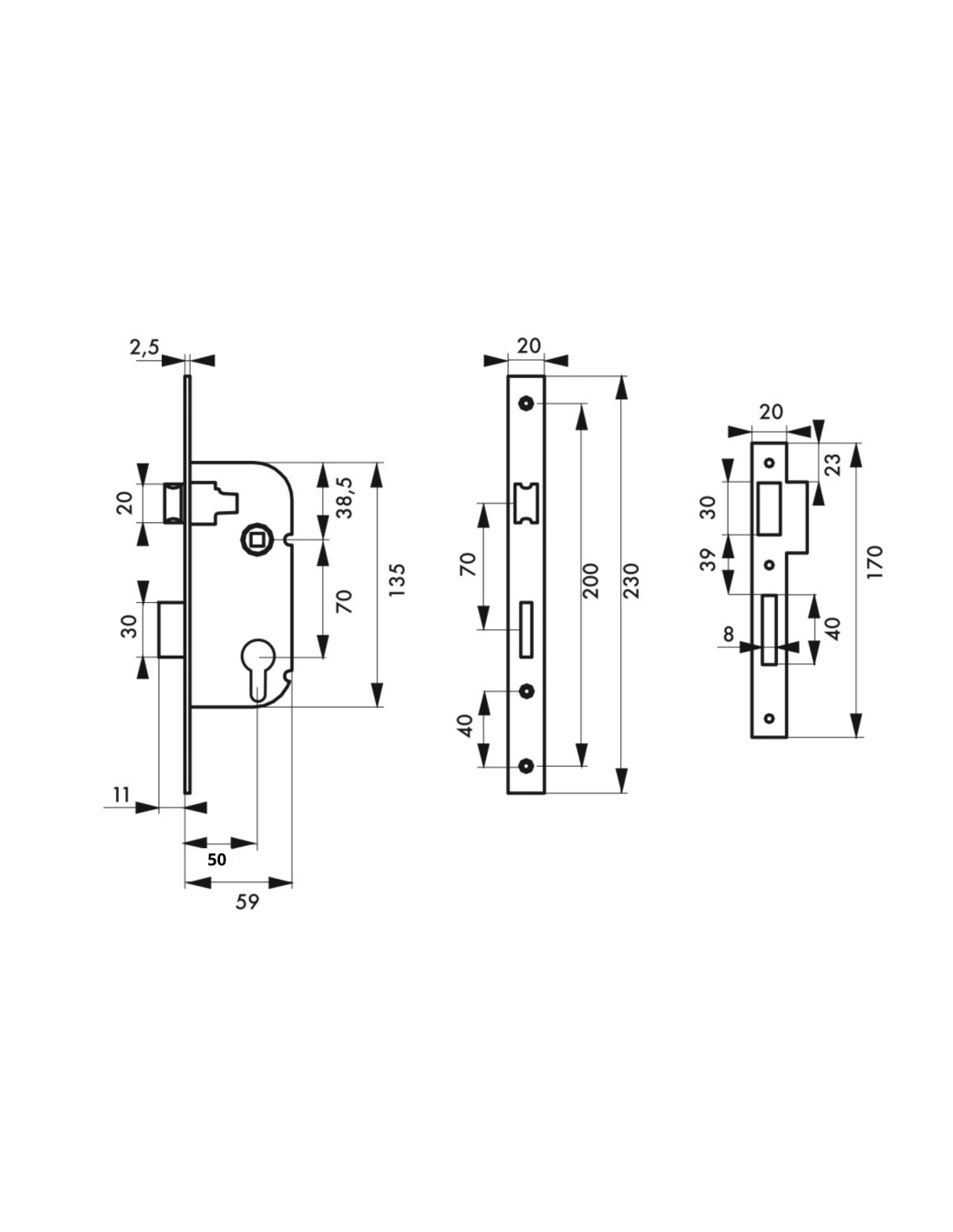 Boitier de serrure encastrable à cylindre pour porte d'entrée, axe 50mm, bouts ronds, zingué - THIRARD