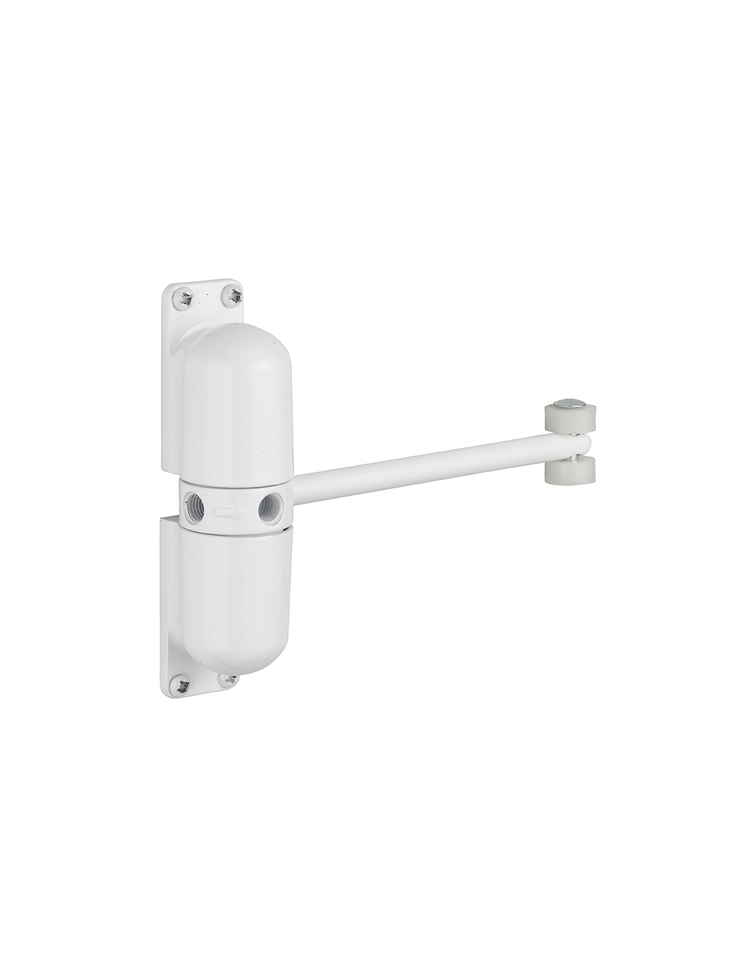 Ferme-porte pour porte légère blanc avec corps en alliage avec tige acier avec roulettes. Possibilité de régler la puissance de fermeture. Dispose d'un angle de 90° maximum. Sans support, à poser sur la porte. Fermeture automatique pour porte de 10 à 30kg maximum. S'adapte aux portes d'ouverture droite ou gauche.