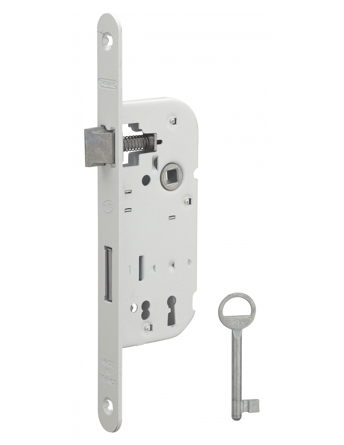 Serrure encastrable NF à clé pour porte de chambre, axe 40mm, bouts ronds, blanc, 1 clé - THIRARD