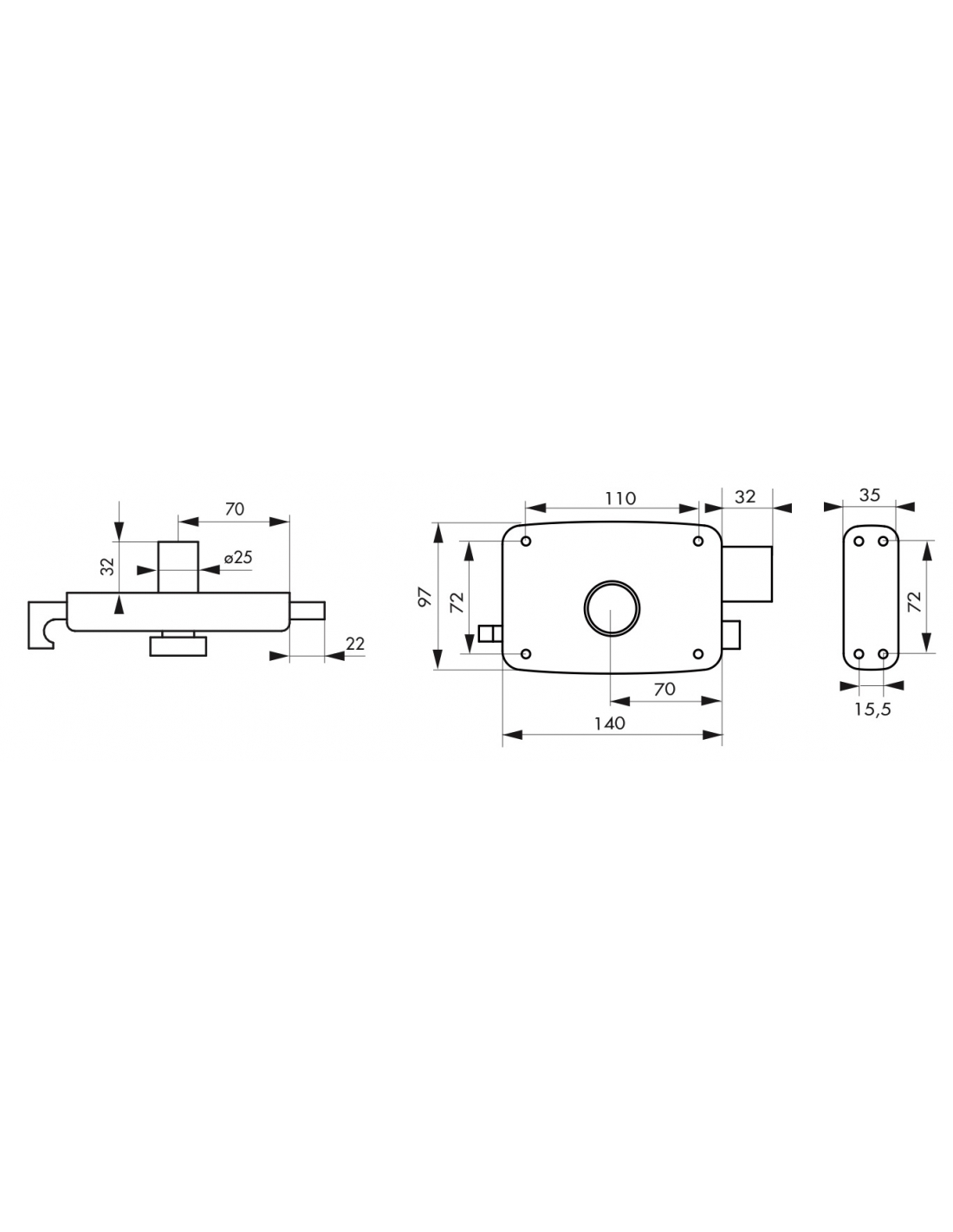 Coffre et gâche acier embouti. Cylindre de sûreté à goupilles Ø 25 long. 32 mm. Bouton de condamnation intérieure et tirage. Pêne et demi-tour laiton. Rappel du demi-tour par la clé. 3 clés laiton nickelé