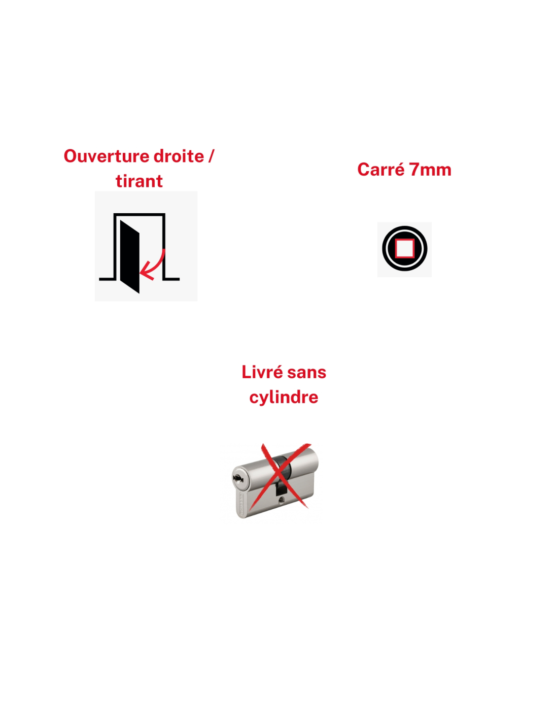 Cette serrure est livrée « nus » — sans cylindre — ce qui permet d’ajouter ou de choisir le cylindre souhaité, selon le besoin de longueur ou de sécurité.