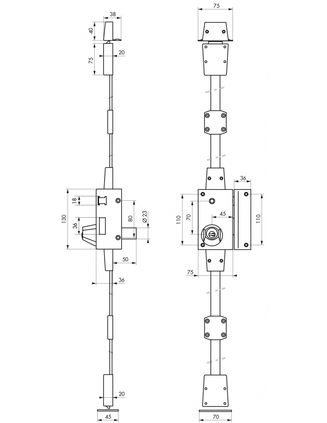 Boîtier en acier cambré ép. 20/10ème. Coffre cambré 75x130mm axe à 45 mm. Jeu de tringles pour une hauteur maximum de porte de 2,25 m. Mécanisme intérieur type équerre permettant la manœuvre du 1/2 tour de l’intérieur comme de l’extérieur avec la clé. Pêne et 1/2 tour en laiton massif. Pênes haut et bas en acier zingué. Gâche avec têtière de haute résistance. Enjoliveur de cylindre côté intérieur. Carré 7mm. Poignée double anodisé champagne fournie. Le montage de la serrure ne nécessite pas d’entaillage spécifique de la porte.